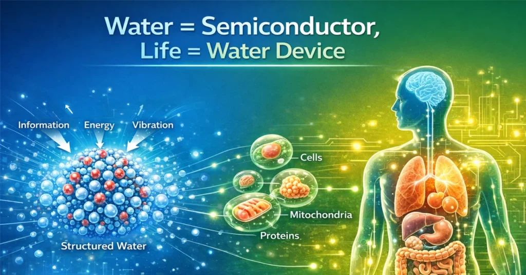 水は半導体であり、生体は水デバイスである。この視点に立ったとき、健康、環境、生命の理解は、物質に何を足すかではなく、場と構造をどう整えるかという問いへと転換する。これは水を巡る思想の転換であり、同時に生命を理解するための新しい物性言語である。